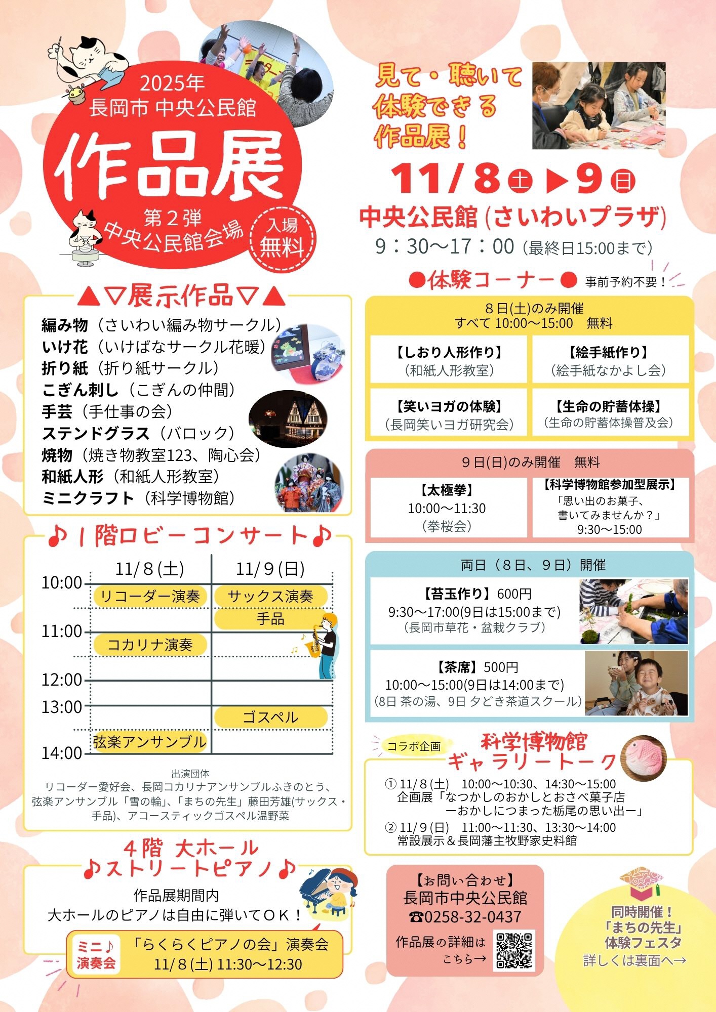 また、中央公民館会場では、様々な活動が体験できるコーナーや、ロビーコンサートも併せて実施します。