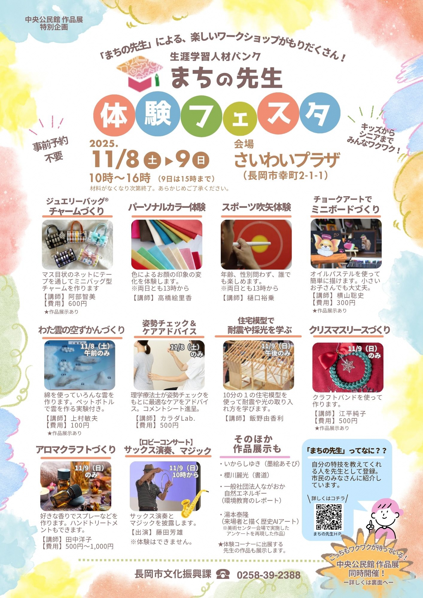 このたび、中央公民館作品展の特別企画として、「まちの先生」たちの「学び」を体験できる体験会を開催します。