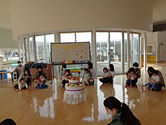 | 3月21日(金)にっこり誕生会 7人の3月生まれさんおめでとう! 「いくつになったかな?」 ママと一緒にインタビューに答えました。 |