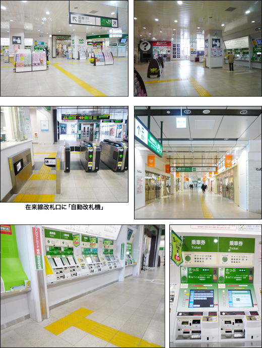 改札口横に「みどりの窓口」「びゅうプラザ」「自動券売機」を一体として移設し、あわせて、在来線改札口に「自動改札機」を導入したり、エレベーターやトイレ等の増設や床・天井の改良、分かりやすい案内表示への改善など、だれもが使いやすくて明るく開放感のある駅作りを目指しました。