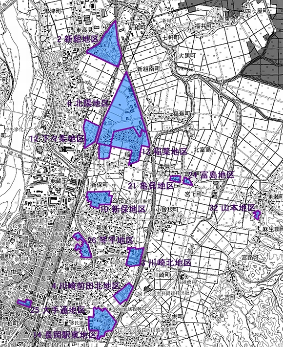 | 14 | 長岡駅東地区 | 四郎丸町、川崎町、中沢町、美沢3丁目、美沢4丁目の各一部 | 約23.6 | 平成13年6月29日 (令和元年8月19日) |