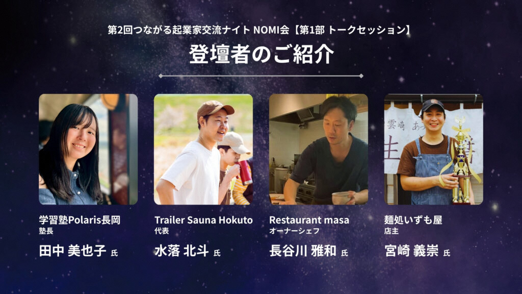 「地域で挑戦するということ-ローカル起業家たちのリアル-」 ゲスト 学習塾Polaris長岡 塾長 田中 美也子 さん Restaurant masa オーナーシェフ 長谷川 雅和 さん Trailer Sauna Hokuto 代表 水落 北斗 さん 麺処いずも屋 店主 宮崎 義崇 さん ■第二部 起業家交流会