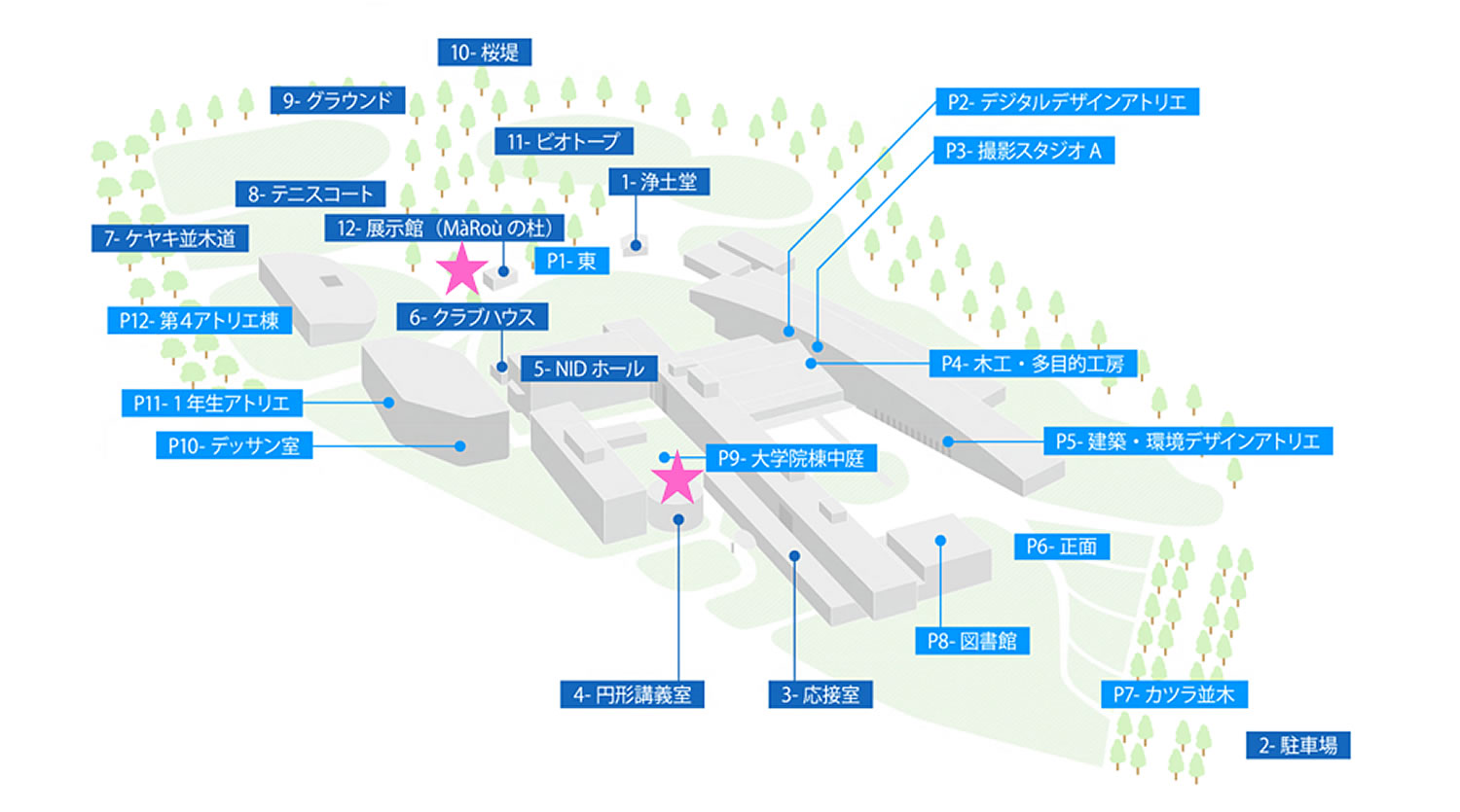会場 | 長岡造形大学(長岡市千秋4丁目197番地) キャンパス内 展示館 MàRoùの杜(マルのもり)裏 ※全体図をご確認ください。 |