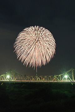 そして、直径650メートルの正三尺玉。王者の貫禄とも言うべき大輪、ゆっくりしだれるさまにしばし見とれ・・・、そして、大歓声が沸き起こりました。