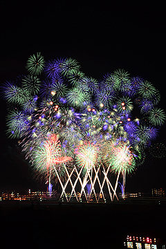 5色のスターマインが一斉に打ち上げられた超大型ワイドスターマイン。水面に映る姿が美しさをいっそう際立たせます。