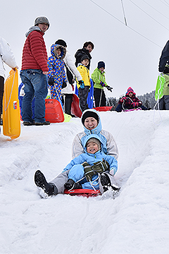 7日は天候に恵まれ、多くの親子連れがそり遊びや雪中宝探し、スノーモービル試乗などを楽しみました。