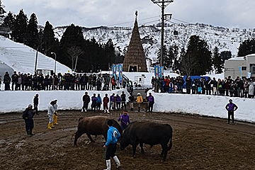 雪中角突き大会では、力のこもった取り組みに大きな歓声が上がりました。