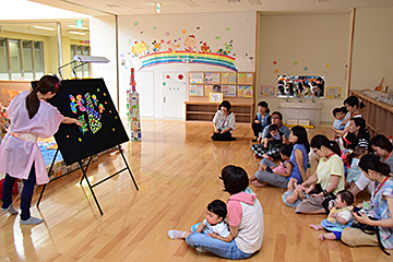 いつも遊んでいる「じゆうひろば」には、短冊の付いた笹や飾りが。保育士が彦星と織姫になり、子どもたちと一緒に手遊びをしたり、七夕の歌を歌ったりしました。