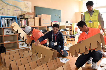 今年新たに取り入れた福祉避難室の開設訓練では、介護の必要な人に配慮した背の低い段ボールベッドの組み立てや避難室の開設までの流れを実践。