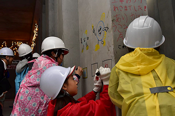 壁に「長い間、工事おつかれさまでした」「長岡を大雨から守ってください」など、激励と感謝を込めたメッセージやイラストを残しました。