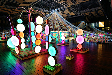 小国和紙を通して届く柔らかな光は、音に反応して次々に色が変化!背景に見えるアオルミネーションと合わせて、さまざまな色彩が楽しめます。