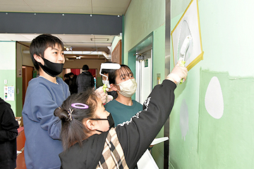 中之島中央小学校の6年生55人が、築45年の校舎を明るく若返らせようと、中之島地域のシンボルを廊下の壁に描きました。