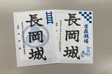 御城印は2種類。長岡藩牧野家の家紋「三ツ柏紋」を背景に、長岡城のシンボルである本丸御三階櫓(やぐら)などをあしらった「本丸跡版」と、「常在戦場」の文字とともに長岡城の内装にも使われた市松模様などをあしらった「二の丸跡版」です。