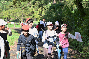 稼働初日、公園近くの栖吉小学校6年生60人がコンテンツを体験。園内を散策し、タブレットを案内板にかざすと始まるアニメーションでの解説に耳を傾け、楽しく学習していました。