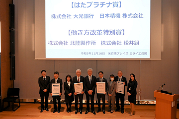 同日、今年度新たに創設した「はたプラチナ賞」の表彰式を行いました。働き方改革において地域企業のロールモデルになる優れた取り組みを行う企業2社が決定。6カ月以上の育児休業取得者に夕食の宅配費用の補助などを行う㈱大光銀行と、管理職を対象に女性の健康を学ぶセミナーなどを実施した日本精機㈱が選ばれました。