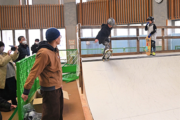 親子向けの体験会を開催。初めてでも、巧みにボードを動かしスイスイ滑る子やU字型の構造物「ミニランプ」に挑戦する子もいて、会場は大いににぎわいました。