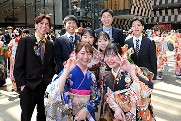 長岡地域会場のアオーレ長岡は、おしゃれなスーツや華やかな振袖に身を包んだ参加者でいっぱいに。