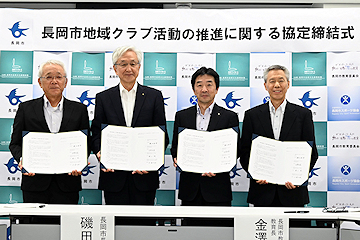 この日は、長岡市と長岡市教育委員会、長岡市スポーツ協会、長岡市芸術文化振興財団で協定を締結。4者が連携することで、市内の中学生が将来にわたってスポーツや文化芸術に継続的に親しむことができる機会を確保し、持続可能な活動環境の整備を図ります。