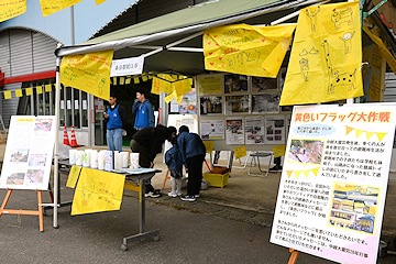 自衛隊車両の展示や国道番号の缶バッジ作り、感謝のメッセージなどを書いた黄色いフラッグの掲示など、盛りだくさんの内容。