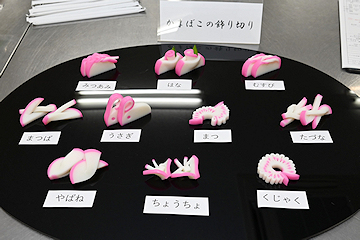 子どもたちは使い慣れていない包丁を慎重に動かし、かまぼこの飾り切りにも挑戦。苦戦しながらも、うさぎや松などの飾り切りを見事に完成させました。