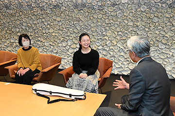 磯田市長を訪れた後藤さんは「全国大会で演奏した曲は、歌うような旋律が好きで選んだ。当日は集中して演奏できました」と報告。コンクールで演奏した曲を披露してくれました。
