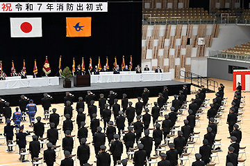 式典では、長年勤める団員の表彰や、学生消防団の認証状を交付。