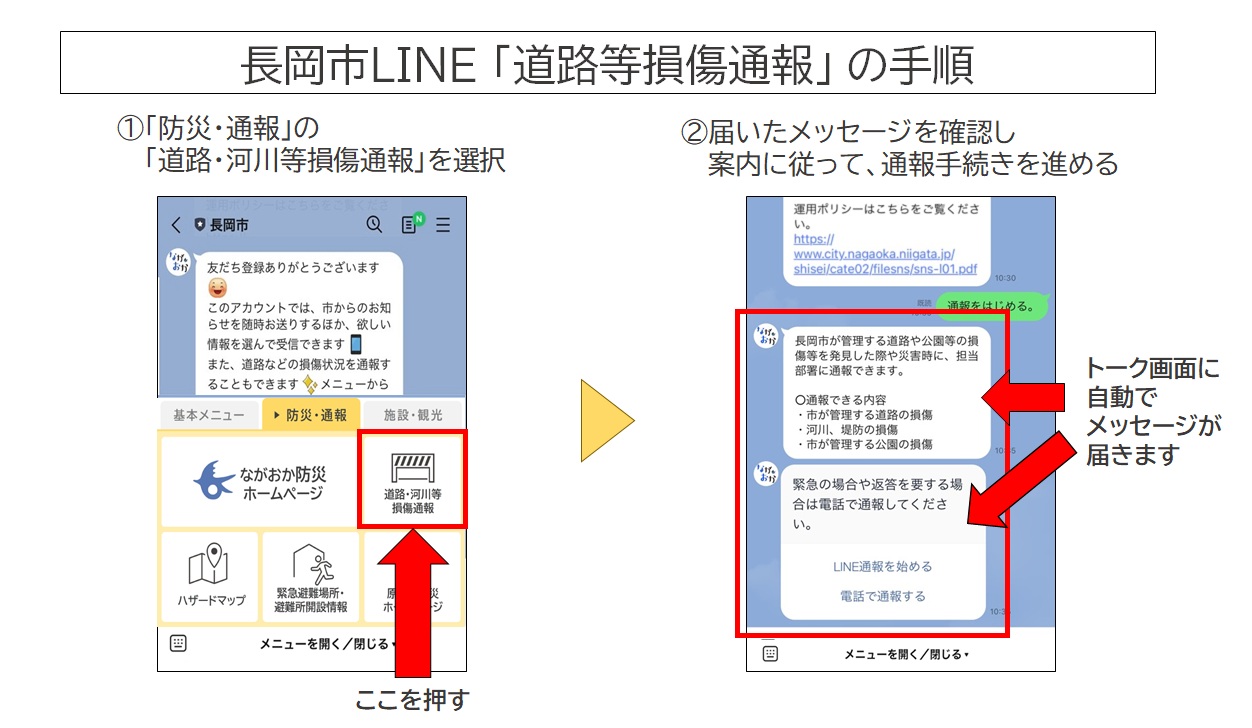 長岡市が管理する道路や河川、公園などの損傷情報について、従来からの電話での通報に加え、スマートフォンアプリ「LINE」の長岡市公式アカウントから通報することができます。