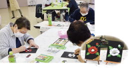| 和島地域の高齢者が集う「いきいき大学」で、チョークアートに挑戦。指でくるくるこすりながら、満開の紅白の椿を描きました。(10月7日) |