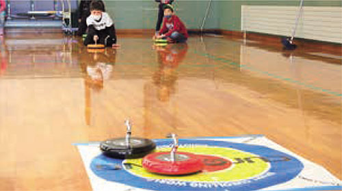 山古志小学校の児童が、室内でカーリングを楽しめる「カローリング」に挑戦。狙いを定めて投球する姿はまさに真剣そのもの!(3月29日)