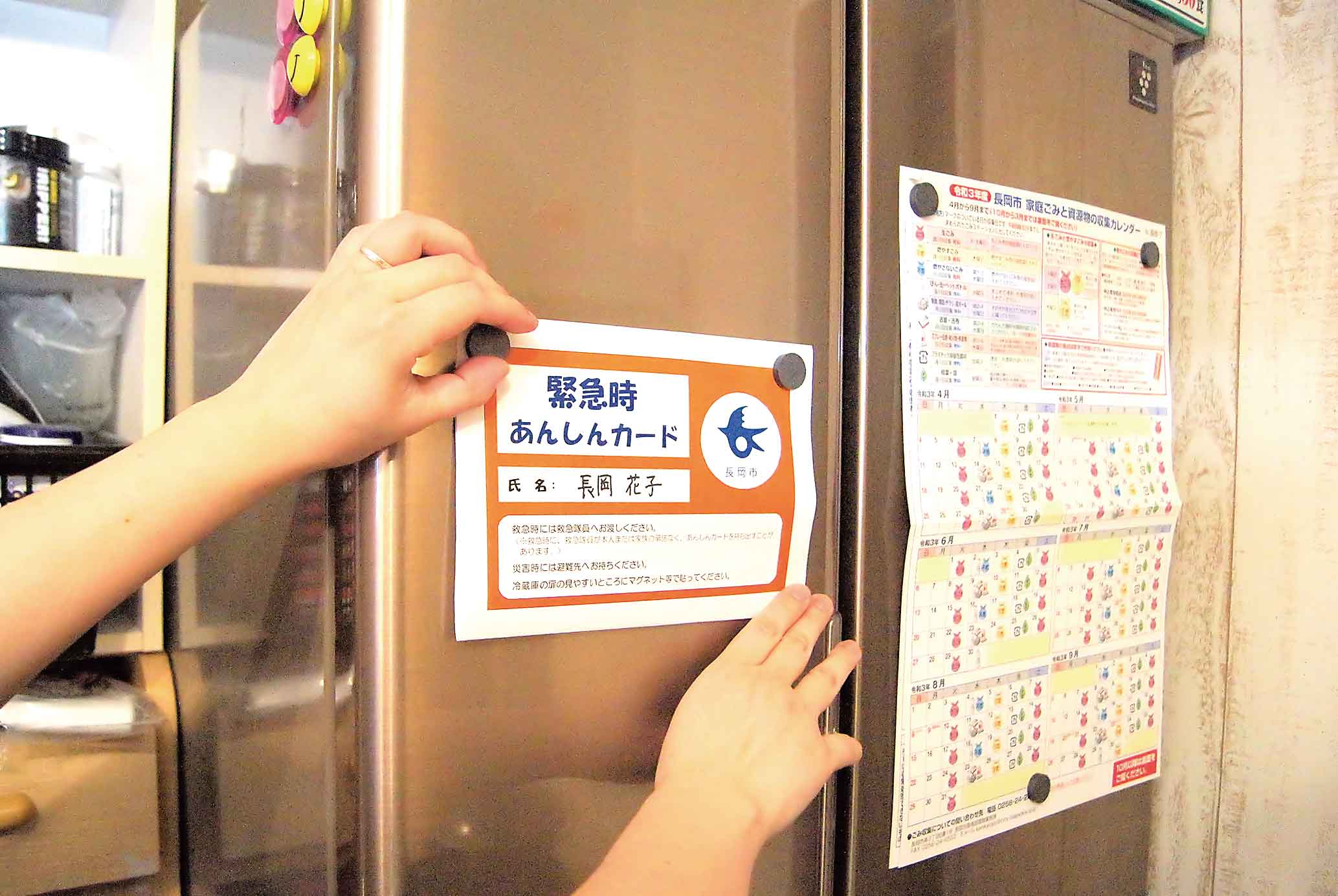 名前・生年月日などの基本情報、健康状態、 連絡先を書いて自宅の冷蔵庫に貼っておきます。災害時、救急隊員など個人を特定できるほか、避難場所に持参して自分の情報を簡単に伝えることができます。