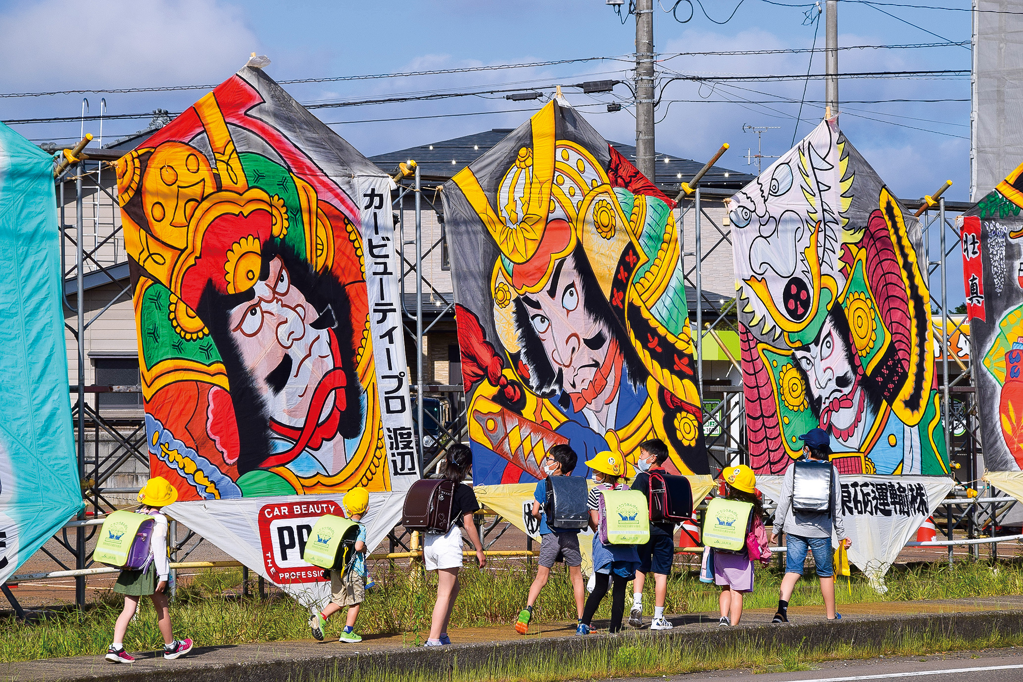 中之島地域の伝統である大凧が、まちなかに登場。ずらりと並んだ色鮮やかな凧に、通学中の小学生も 思わず目がくぎ付けになりました。(6月1日)