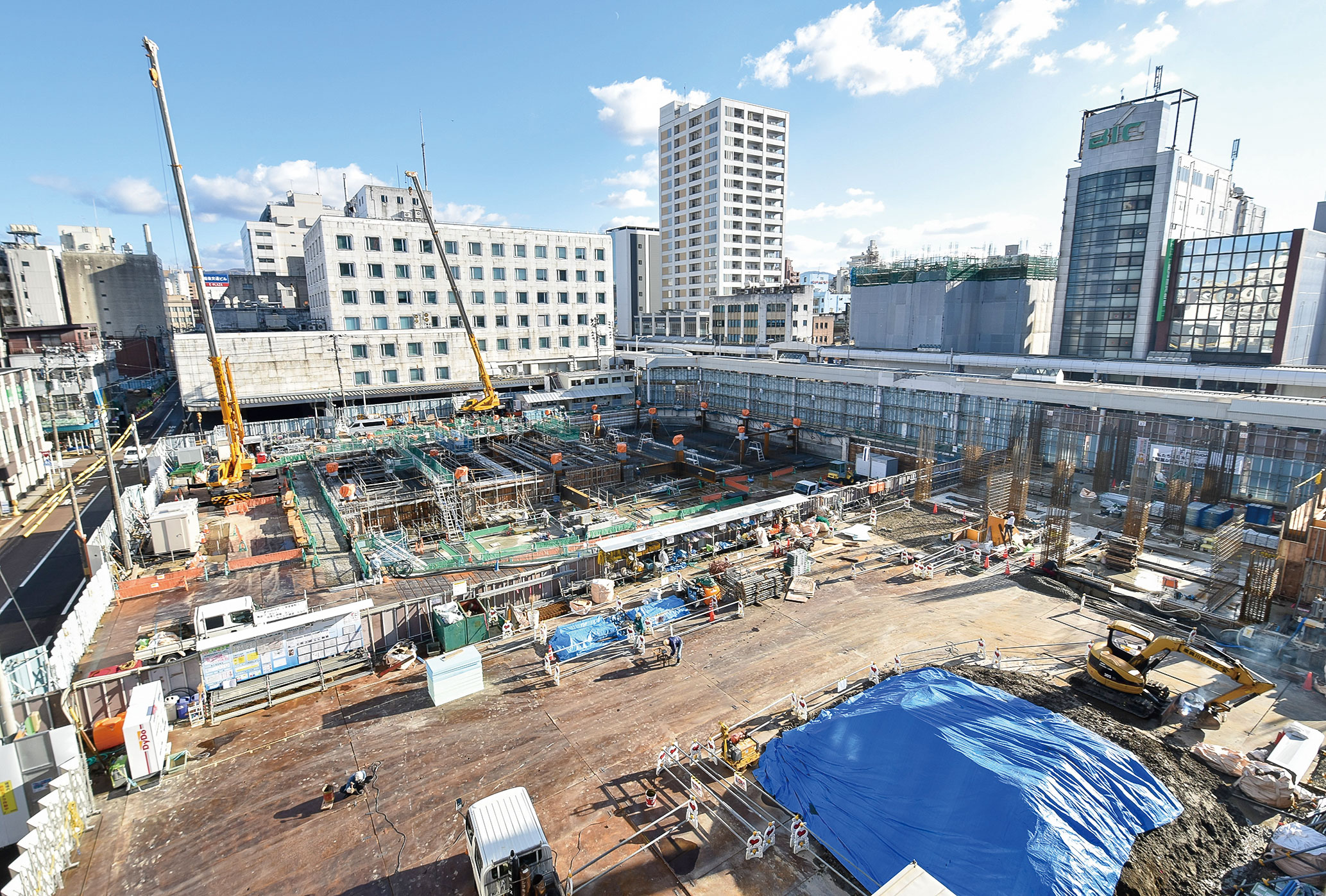 ▲鉄骨の組み立てが始まる建設現場(12月9日、大手通2)