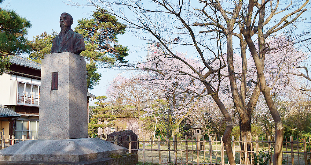 中之島地域の大竹邸記念館で、今年も桜が花を咲かせました。大河津分水路の整備に尽力した大竹貫一の像の表情も、心なしかうっとり!?
