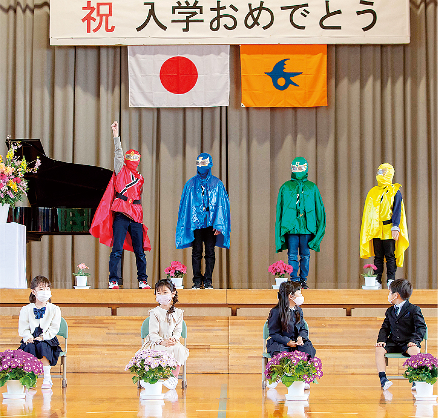 三島地域の日吉小学校で入学式を行いました。在校生がヒーローとなり、待ちに待ったピカピカの1年生10人を歓迎しました。