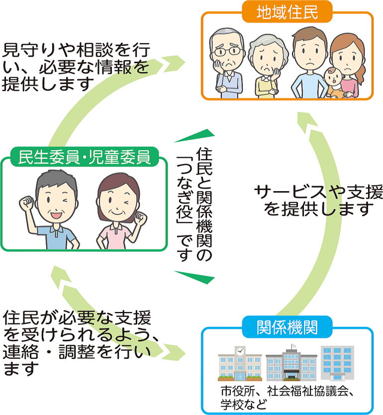 民生委員・児童委員は、厚生労働大臣が委嘱するボランティアです。住民とのふれあいや見守りを通じて、介護や子育てなどの困りごとを解決できるよう手助けします。