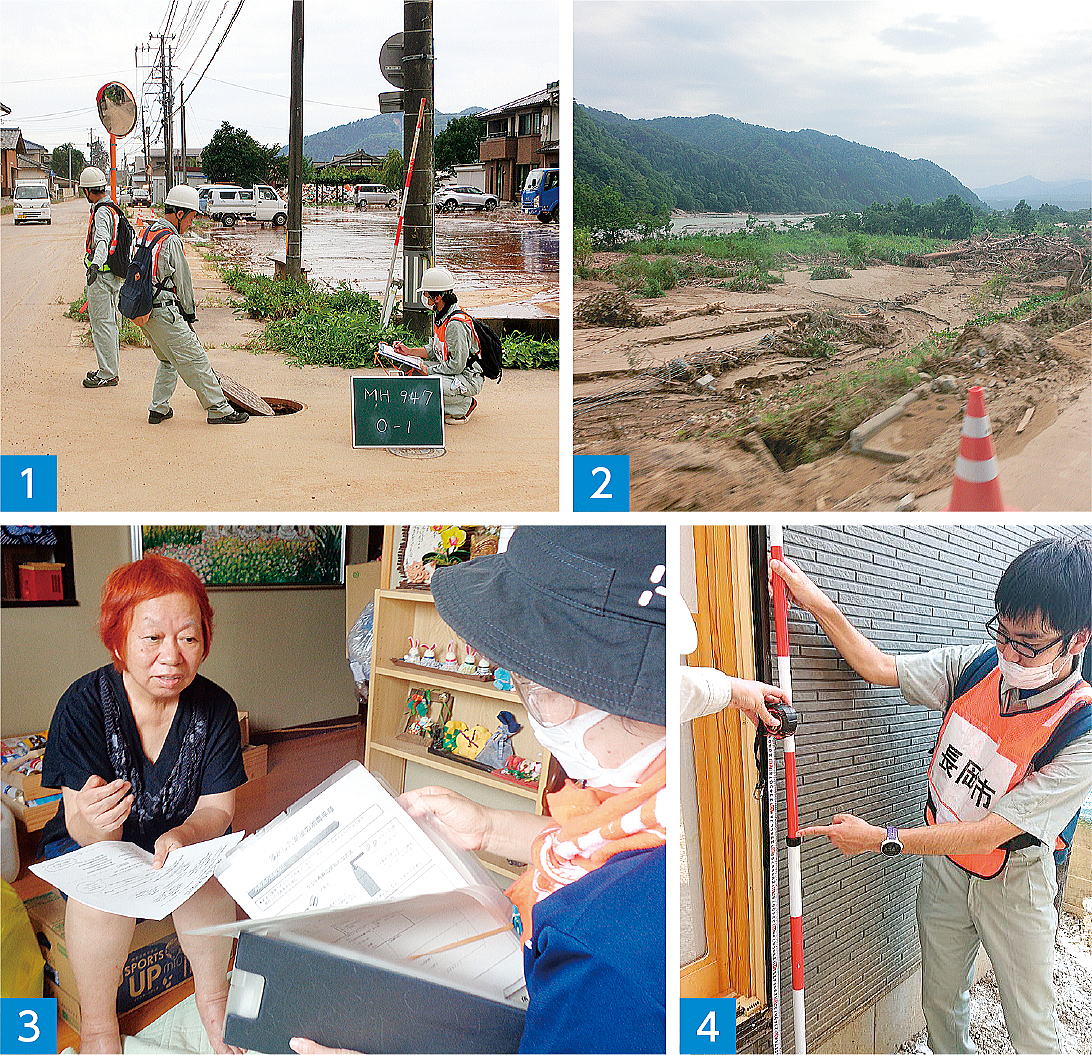 現地では、給水車による応急給水(左写真)や下水道施設の点検、被災家庭の健康調査、家屋の被害認定などの支援活動を行いました。