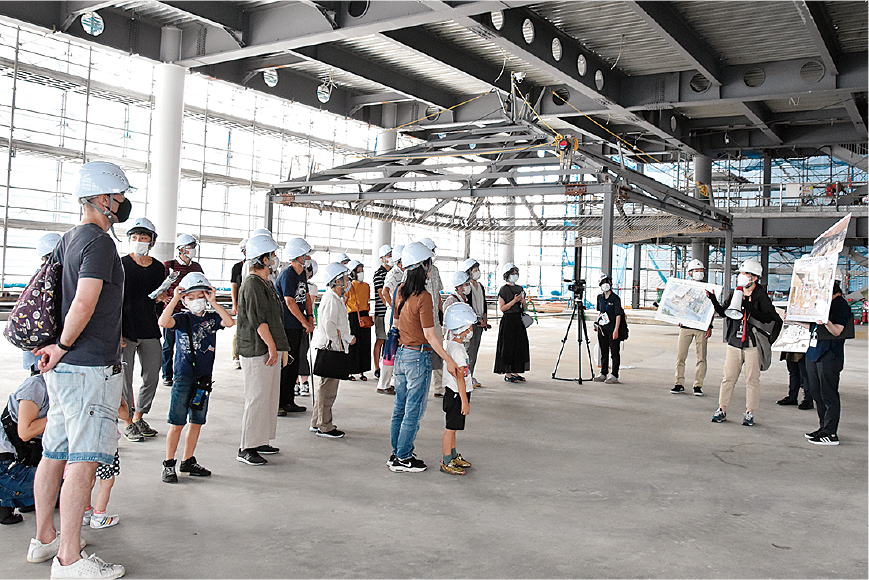 オープンまで1年の「ミライエ長岡」。建設現場を58人が見学しました。工事中のフロアでタブレット端末をかざすと、整備後のバーチャル映像が出現。完成する施設の空間や使い方をイメージしていました。(7月24日)