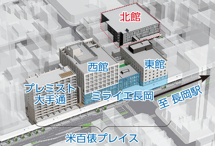 大手通坂之上町地区に市街地再開発事業で整備を進めている米百俵プレイス。同地区北館に進出する事業者