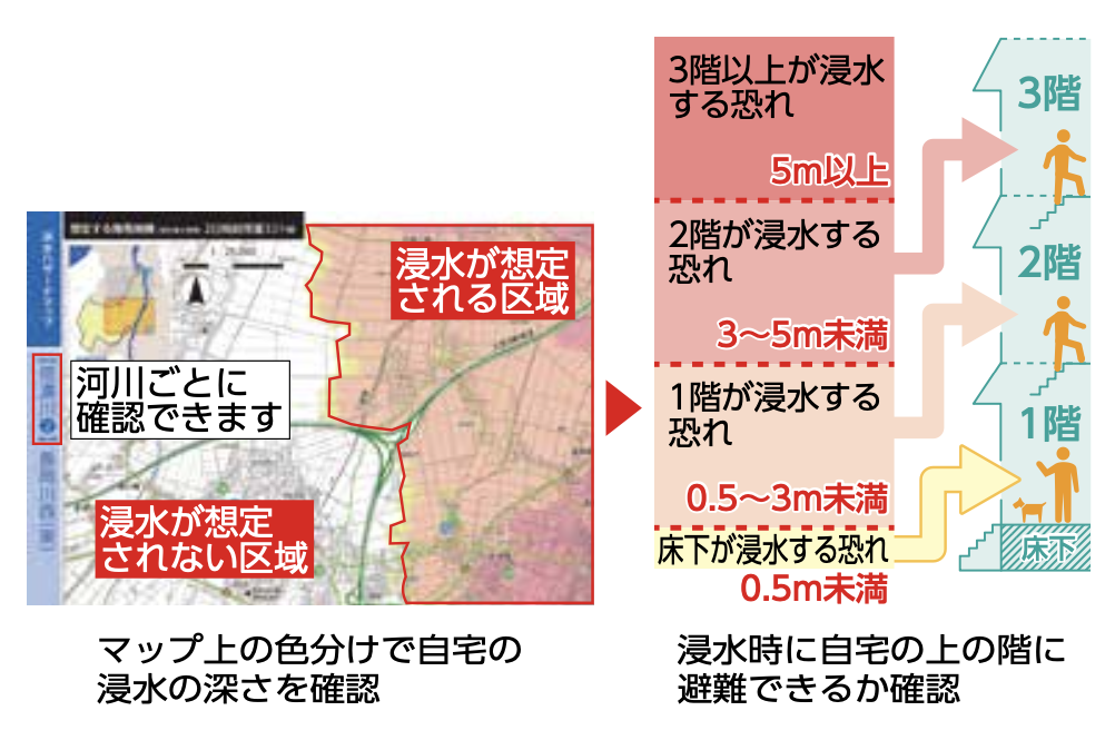 洪水ハザードマップで、自宅が「浸水するか」や「水に流されて倒壊する恐れはないか」を確認しましょう。避難方法や避難先を事前に決める判断基準になります。