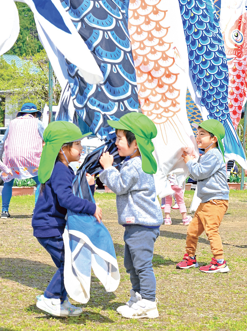 越路地域の岩塚保育園の園児が、渋海川沿いを泳ぐ「岩田鯉のぼり」を見にお散歩へ。体の倍以上あるこいのぼりを見つけて、思わずハグ!