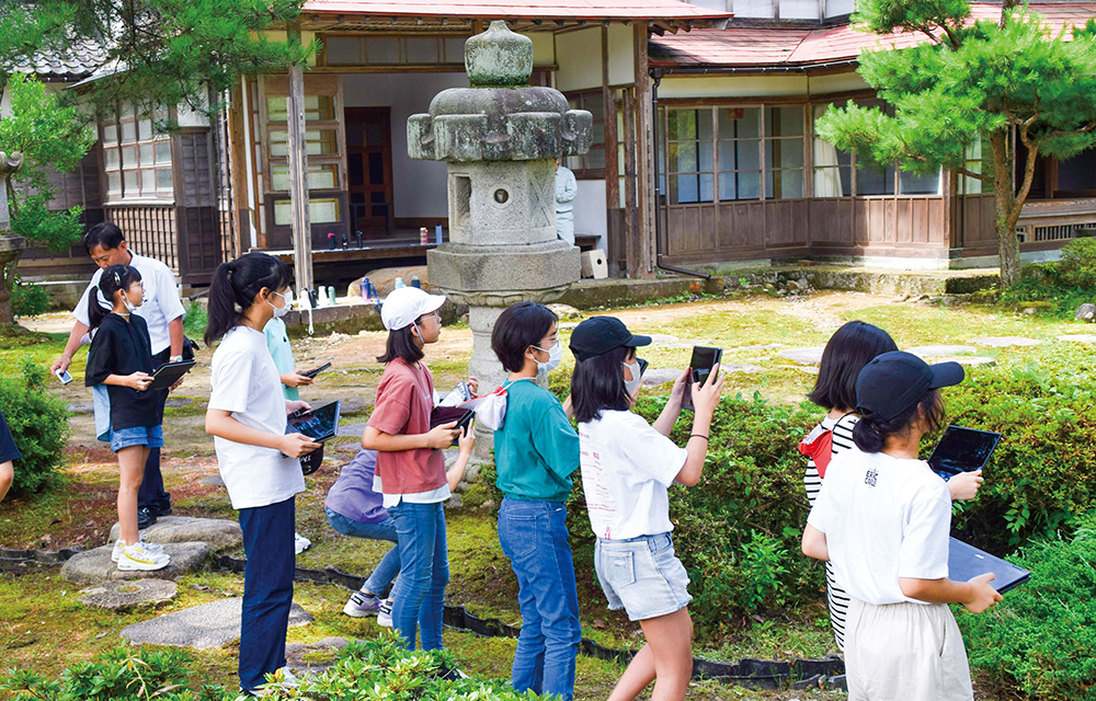 和島小学校の6年生が地域の宝「住雲園」で写真撮影に挑戦。プロの手ほどきを受け、納得の1枚を収めると「このアングル、いいね!」とますます熱中していました。