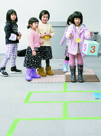 中之島文化センターのフロア一面に、巨大なすごろくが登場しました。サイコロを投げて、ドンドン進む子どもたち。お正月ならではの遊びを楽しみました。