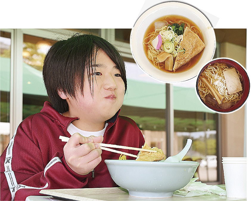 道の駅R290とちおで、栃尾地域と福島県会津坂下町のご当地グルメ・冷やしラーメンの食べ比べを行いました。栃尾のラーメンは出汁の染みたあぶらげ入りで食べ応え抜群。「どっちもおいしいね!」