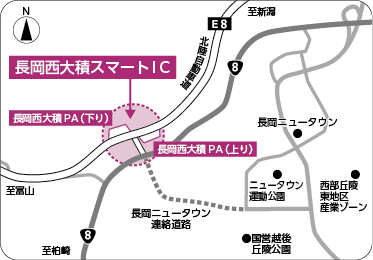 西部地域の産業基盤の強化や観光振興、渋滞緩和などを目的に整備するETC専用のスマートインターチェンジの名称が「長岡西大積」に決定しました。市内では「長岡南越路」「長岡北」に続く3カ所目の設置。開通に合わせて、大積PA(パーキングエリア)の名称も「長岡西大積」に変更します。