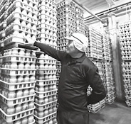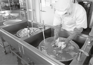 肉や野菜などの食材が次々と届きます。数や重さ、卵の割れ、肉のにおいなど、五感をフル活用し確認。マニュアルやチェックリストも使って、漏れなく行います。