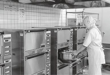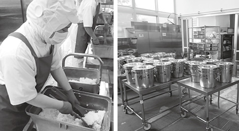 複数の釜で同時に炊飯できる「立体自動炊飯器」を使います。時期により炊き上がりが変わるので、日ごとに水分量を調節。この調理場では1日12釜、60㎏のお米を炊きます。