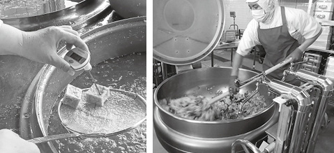 1度に1,000食分のサラダができる大釜で、和える・炒める・揚げるなどを行います。スープはだし汁から、ドーナツなどは生地から作ります。加熱するものは食材の中心温度を見ながら作業します。