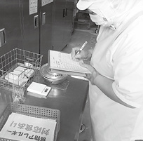 児童・生徒が食べる30分前に学校の先生が検食。調理した私たちも同じ給食を食べて、味や見た目などを確認します。