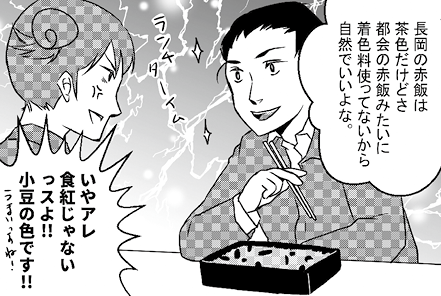 長岡といえばしょうゆ味の茶色い赤飯。赤い赤飯だとがっかりしてしまう。
