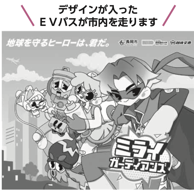 ヒーローは越後交通(株)のEVバスにラッピングされ市内を走ります。改めて、私たち一人ひとりが環境にやさしい暮らしを始めてみませんか。